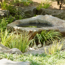 先祖代々受け継がれたマキの木を活かしてリニューアル。先祖代々受け継がれたマキの木を活かしてリニューアルいかに新しい庭となじませるか、腕の見せどころです。 小鳥の水飲み場小鳥の水飲み場